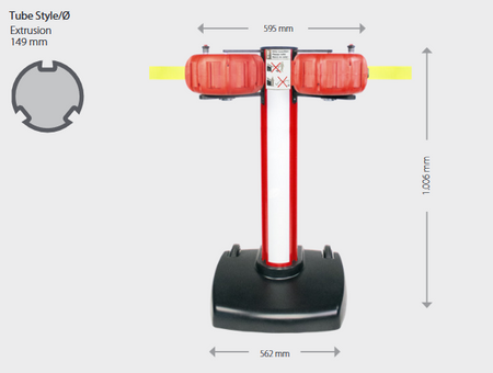 Barijera od aluminija i čelika. 2 x 25 metara uvlačive trake. Boja: Odaberite između neonsko žute, crveno-bijele ili crno-žute. Ukupna težina: približno 55 kg Visina: približno 1000 mm Baza: 562 mm