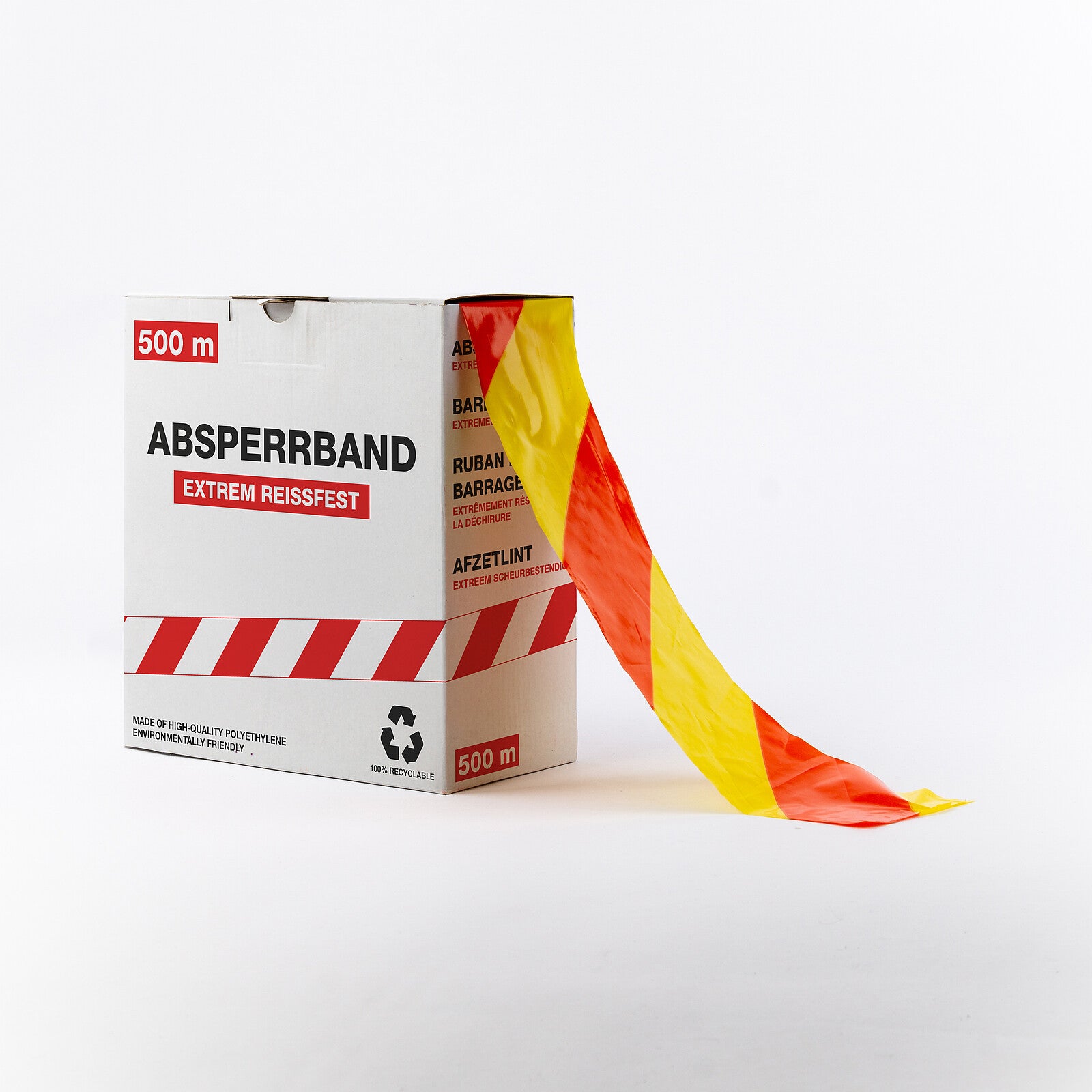 Il nastro segnaletico 'estremamente resistente allo strappo' è realizzato in film LLDPE stirato monoassialmente, che gli conferisce un’eccezionale resistenza alla trazione. È progettato per l’uso in aree in cui è richiesta o preferita la massima durabilità.