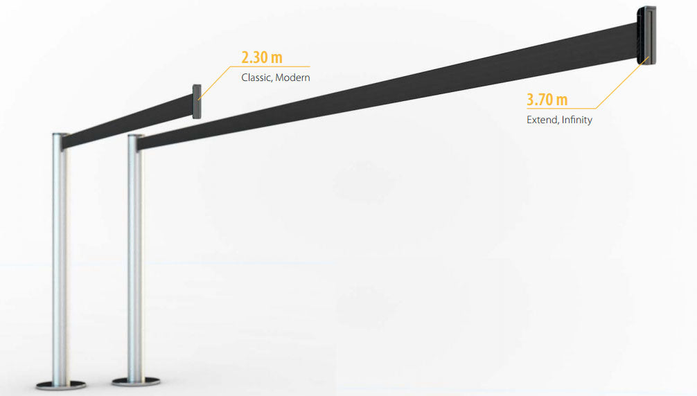 Ovo je naša najpopularnija barijera za maloprodaju te za korisnike iz sektora slobodnog vremena i zabave; elegantan dizajn i profinjena završna obrada ovih izvlačivih barijera osmišljeni su tako da se uklope u većinu shema boja i unutarnjih rasporeda. Svaki stupić ima 4 utora u obliku lastina repa koji služe kao ugrađeni prihvati za izvlačive trake. Svaki stupić dolazi sa standardnom bazom od negumirajuće gume koja ne ostavlja tragove kako bi zaštitila podne obloge.