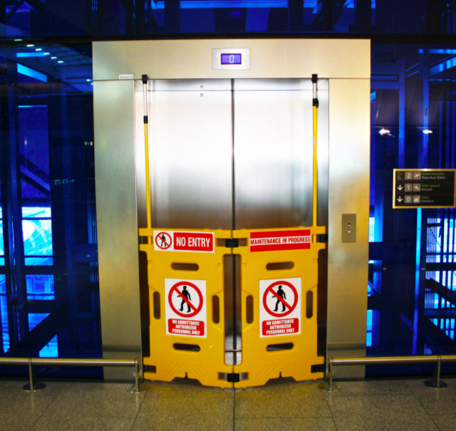 - Barreira de segurança amarela para bloquear um elevador para trabalhos de reparação/manutenção e recolocação em funcionamento