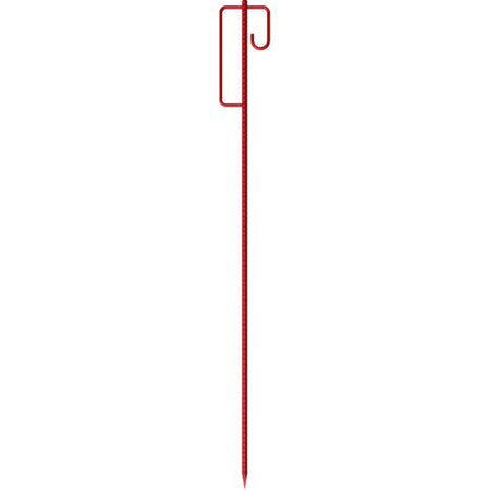 Estaca metálica para vedação com gancho em U soldado para fixação das nossas redes de balizamento e de neve, fita de balizamento, cabos, cordas, etc. A lança metálica pintada de vermelho é fabricada em varão ranhurado de ø12mm com ponta forjada para uma montagem fácil no solo.